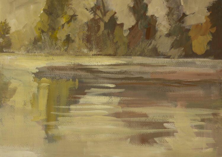 Abstract landscape of lakes gouache painting. reflections in the water of the autumn forest. Beige-ochre brown shades of paint. A quick authentic sketch. Beautiful autumn background for art design.