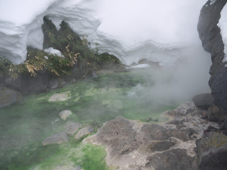 Thermal volcanic creek with green algae in winter scenery with snow, bamboo and steam rising from hot water, Iturup hot springs on Kurill islands